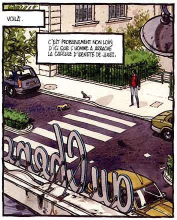 Un regards sans cadre sur la chaussée, au carrefour, et un autre plus petit sur le trottoir. (In «CLARA - Faux-fuyants», page 40, de CHAUZY et Lapierre Ed. Casterman - 1999)