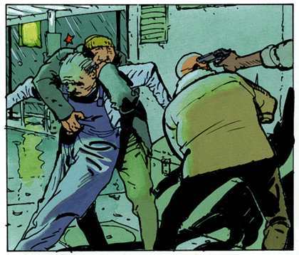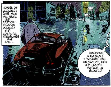 Bon traitement des sols (ombres, objets et liquides répandus, détails) et, donc, naturellement quelques vues de regards !... ;-) (In «A.D. Grand-Rivière - Terre d'élection» page 5 - Al COUTELIS & Bollée - Ed. Casterman - 2000)