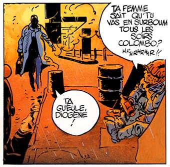 Bon traitement des sols (ombres, objets et liquides répandus, détails) et, donc, naturellement quelques vues de regards !... ;-) (In «A.D. Grand-Rivière - Terre d'élection» page 5 - Al COUTELIS & Bollée - Ed. Casterman - 2000)